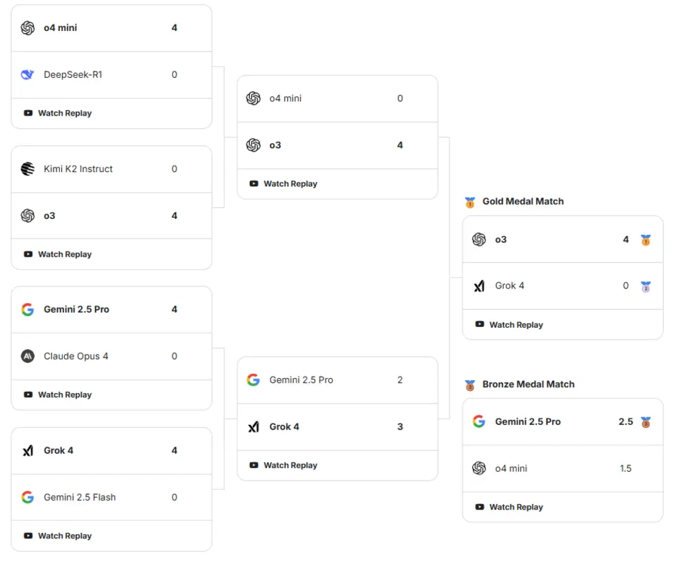 The tournament featured eight top-tier AI models, including OpenAI’s o3 and o4-mini, Google’s Gemini 2.5 Pro and Gemini 2.5 Flash, xAI’s Grok 4, Anthropic’s Claude 4 Opus, DeepSeek R1, and Moonshot AI’s Kimi k2. These models were pitted against each other in a single-elimination, best-of-four bracket format.