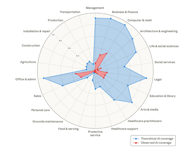 One of the most insightful findings in the sources is the significant “gap” between what AI is theoretically capable of and how it is actually being used. For instance, while LLMs could theoretically handle 94% of tasks in Computer and Math roles, current observed usage covers only about 33%.