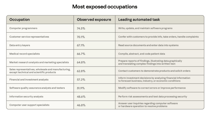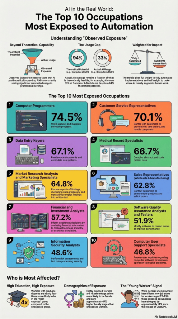 According to the source, certain professions are experiencing significantly higher rates of automated usage than the rest of the economy. At the very top of the list are Computer Programmers, with a 74.5% observed exposure rate, primarily driven by AI’s ability to write, update, and maintain software.